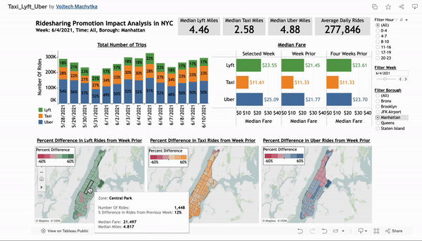 Developed an interactive Tableau dashboard analyzing 2021 ride-sharing data from Uber, Lyft, and taxis in NYC to evaluate the impact of a promotion in a specific borough. This tool provides ride-sharing managers with actionable insights on market trends, fare fluctuations, and geographic usage patterns to inform strategic decisions and optimize market presence.